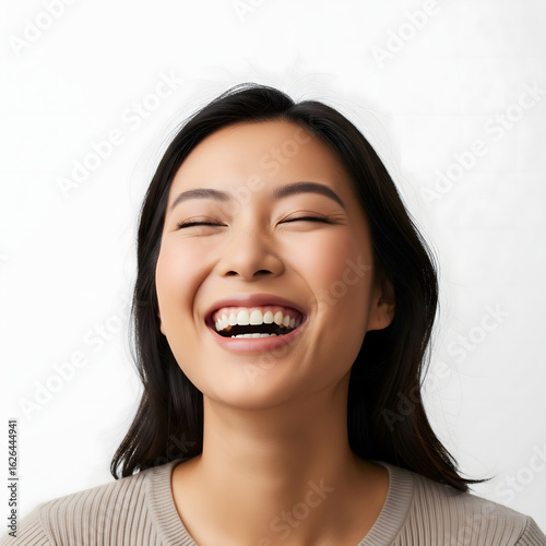 Portrait of a cheerful young Asian woman laughing with genuine joy and happiness, her eyes closed in delight against a clean white studio background.