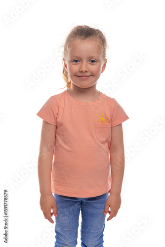 Portrait of a cheerful young girl in a casual orange t-shirt and jeans, standing and smiling confidently against a white background, ideal for concepts of childhood, happiness, and simplicity.