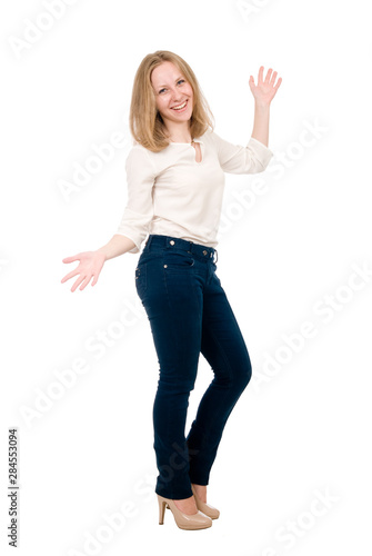 Portrait of a cheerful young woman in jeans with hands side isolated over white background