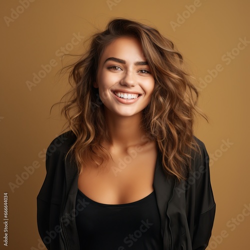 Portrait of a cheerful young woman wearing black shirt standing isolated over yellow background, looking at camera, posing