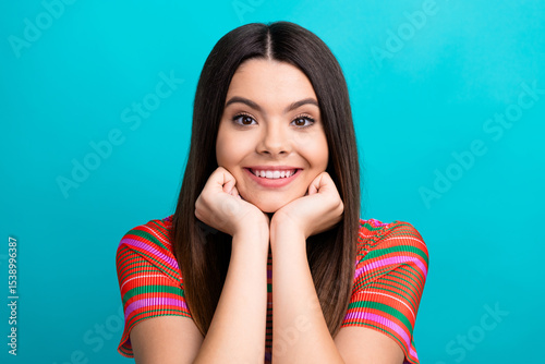 Portrait of a cheerful young woman with a bright smile, hands on her face, captured against a vivid turquoise background
