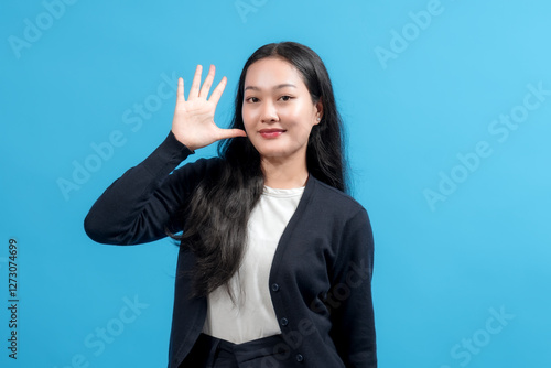 Portrait of a cheerful young woman with long black hair waving hand in greeting against a blue background, showcasing positive emotions, friendliness, and modern fashion styling.