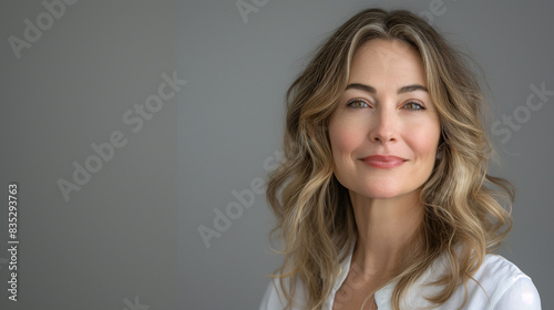 Portrait of a confident mature Caucasian woman with a radiant smile, showcasing natural beauty and healthy skin