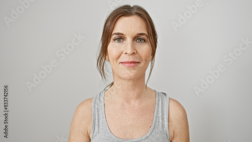 Portrait of a confident middle-aged woman with short hair against a white background, exuding maturity and elegance.