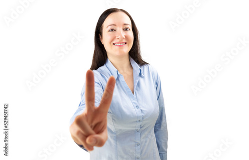 Portrait of a confident young businesswoman showing a peace gesture in a modern office