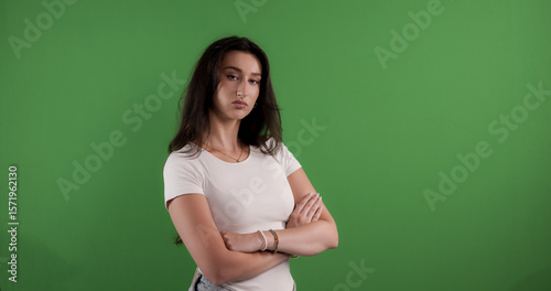 Portrait of a confident young woman crossing her arms, looking serious and determined on a chroma key background