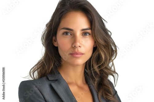 Portrait of a confident young woman with long, wavy hair, wearing a tailored suit and exuding professionalism.