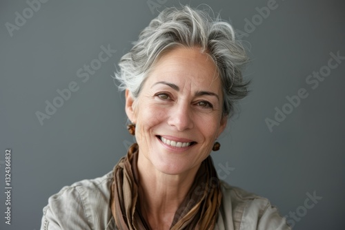 Portrait of a content caucasian woman in her 50s smiling at the camera over soft gray background