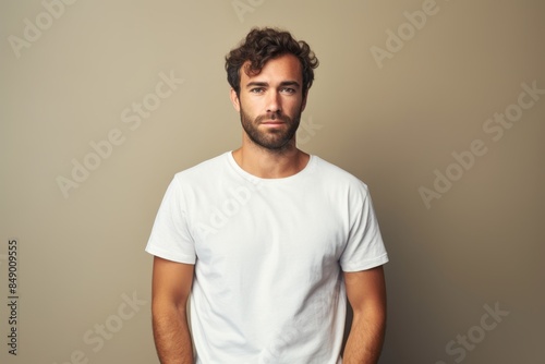 Portrait of a content man in his 30s donning a trendy cropped top over blank studio backdrop