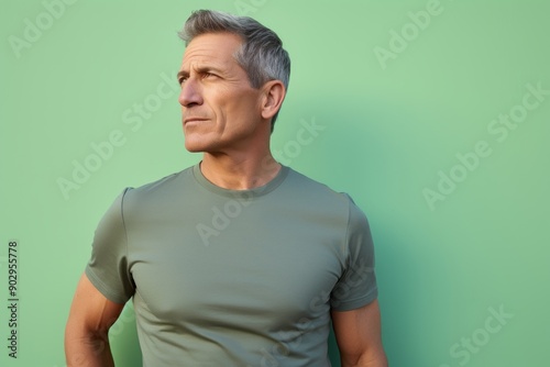 Portrait of a content man in his 50s showing off a lightweight base layer in front of pastel green background