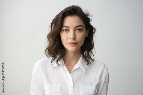 Portrait of a content woman in her 20s wearing a classic white shirt against a white background. AI Generation