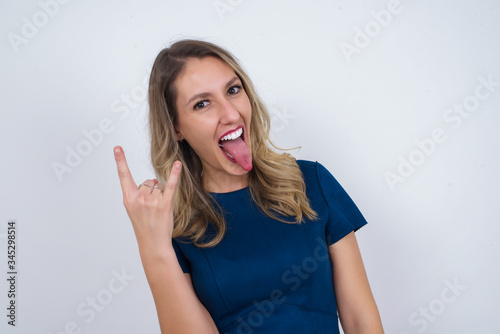 Portrait of a crazy girl showing tongue horns up gesture, expressing excitement of being on concert of band.