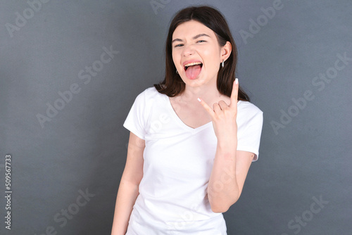Portrait of a crazy young beautiful Caucasian woman wearing white T-shirt over studio grey wall showing tongue horns up gesture, expressing excitement of being on concert of band.