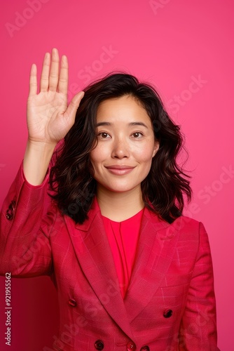 Portrait Of A Cute Asian Businesswoman Raising Her Hand To Introduce Herself In An Office, Smiling Coquettishly, Standing Against A Pink Background