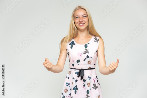 Portrait of a cute beautiful pretty woman girl with long beautiful hair on a white background in a pink dress with a pattern. Shows many different emotions, smiles and talks. Made in a studio.