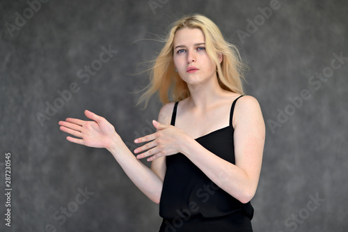 Portrait of a cute blonde student girl, a young woman in a black dress with beautiful curly hair on a gray background in different poses. Shows hands to the sides. Beauty, brightness, emotions.