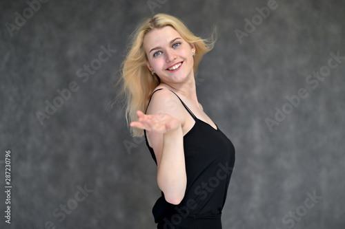 Portrait of a cute blonde student girl, a young woman in a black dress with beautiful curly hair on a gray background in different poses. Shows hands to the sides. Beauty, brightness, emotions.