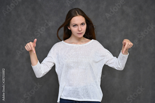Portrait of a cute brunette girl, a young woman with beautiful curly hair in a white sweater on a gray background. Smiling, talking with emotions, showing hands to the sides.