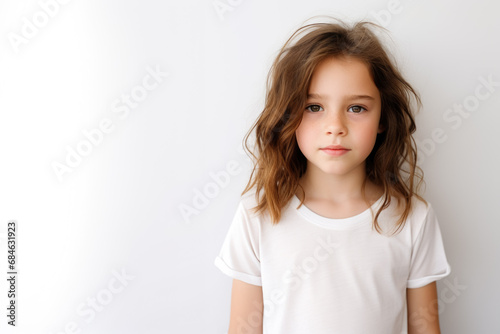 Portrait of a cute kid, girl, neutral expression, white and neutral teeshirt and background, serious