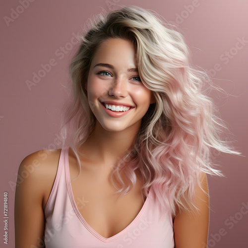 Portrait of a Cute Woman with Short Pink Hair on Pink Studio Background
