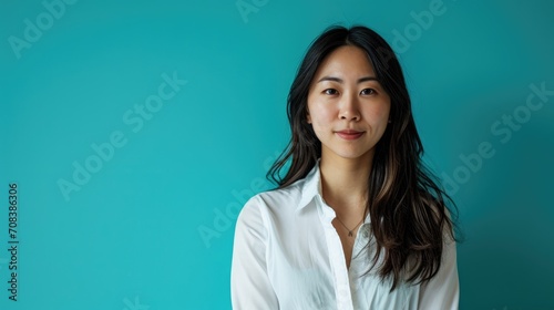Portrait of a Determined Female Software Developer in White Shirt on Teal Background