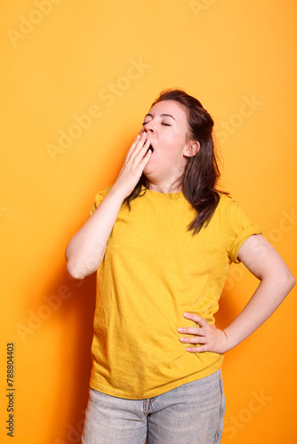 Portrait of a drowsy, young Caucasian lady in a studio, covering her mouth and yawning. Weary woman with hand on her waist, posing in front of camera and drifting off to sleep.