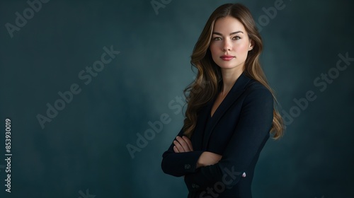 Portrait of a Elegant Investment Banker in Dark Suit on Blue Background with copy space for text