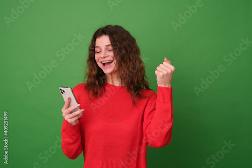 Portrait of a European beautiful girl in red clothes on a green background. The girl holds it in her hand looks at the phone and is happy about the received message