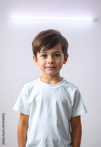 Portrait of a fictional young little boy wearing a plain white t-shirt. Isolated on a plain neutral background., glowing neon