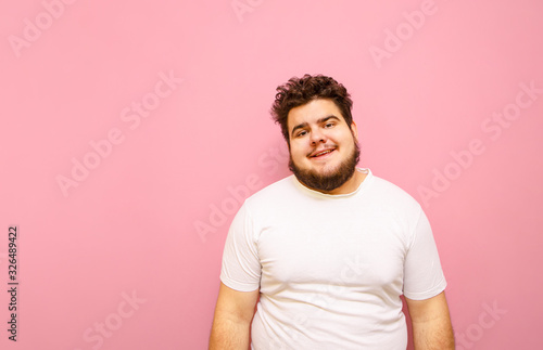 Portrait of a funny overweight guy on a pink background, wearing a white t-shirt and beard, looking into the camera and smiling. Positive fat guy isolated on pink background. Copy space