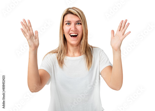 Portrait of a girl joyfully gesturing with her hands isolated