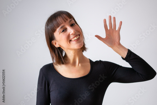 Portrait of a girl on white background. Brown short hair girl. Happy girl waving hand