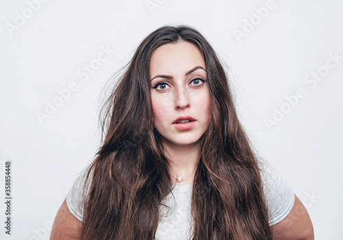 Portrait of a girl with long dark hair on a white background looking at the camera. Light surprise.
