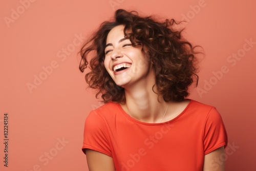 Portrait of a glad woman in her 30s laughing isolated on blank studio backdrop