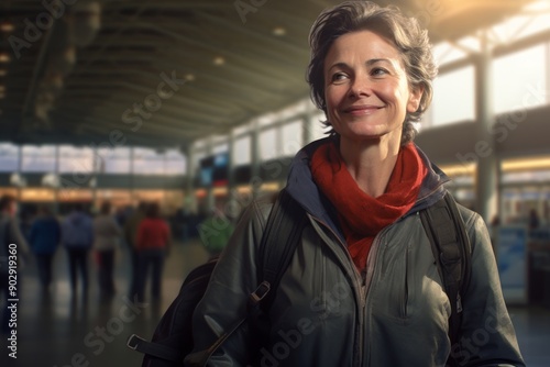Portrait of a glad woman in her 50s dressed in a thermal insulation vest on bustling airport terminal