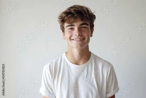 Portrait of a handsome young man in white t shirt smiling while standing against white background