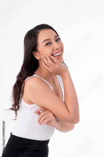 Portrait of a happy Asian beautiful woman and beautiful skin. Concept of Skin care and nutritious food