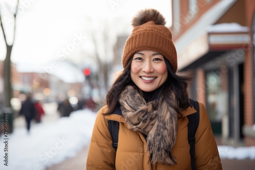Portrait of a happy asian woman in her 40s dressed in a warm ski hat against a charming small town main street. AI Generation