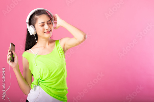 Portrait of a happy attractive woman in summer outfit listening and dancing to music with her headphones isolated over pink background.