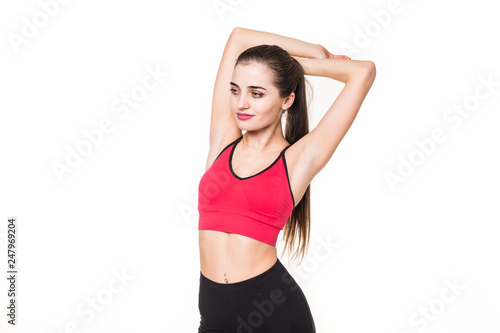 Portrait of a happy fitness woman stretching hands isolated on a white background