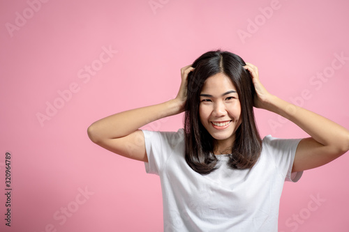 Portrait of a happy girl showing a gesture on a pink background