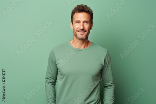 Portrait of a happy man in his 30s sporting a long-sleeved thermal undershirt isolated in soft green background