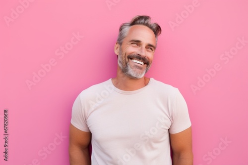 Portrait of a happy man in his 40s donning a trendy cropped top against a solid pastel color wall. AI Generation