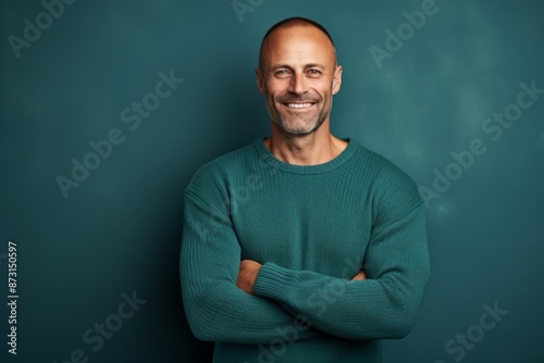 Portrait of a happy man in his 40s wearing a cozy sweater on soft teal background