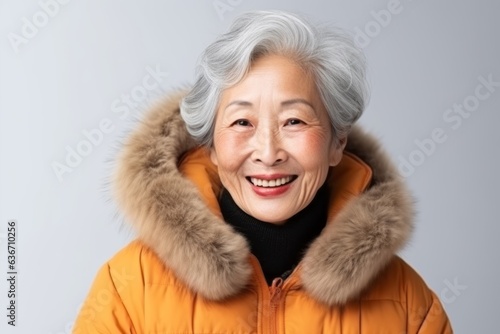 Portrait of a happy senior asian woman wearing warm clothes isolated over white background