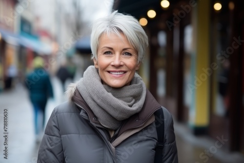 Portrait of a happy senior woman in winter clothes on a city street.