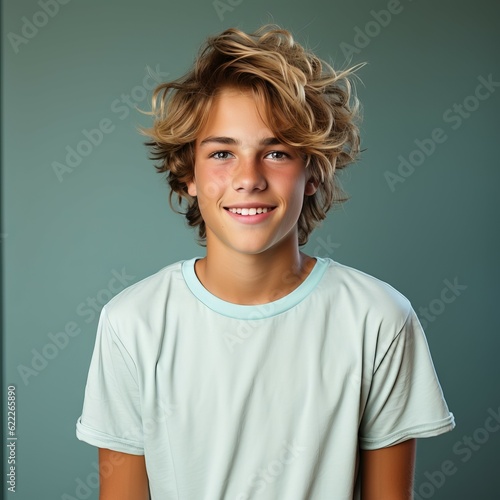 Portrait of a happy smiling teen boy with blond hair. Closeup face of handsome teenage boy with curly hair smiling at camera on a greenish background. Front view, teenager boy in a shirt with a smile.