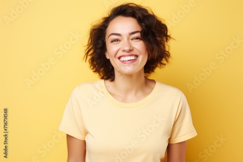 Portrait of a happy woman in her 30s dressed in a casual t-shirt against a pastel yellow background. AI Generation