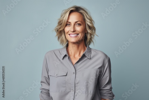 Portrait of a happy woman in her 40s sporting a vented fishing shirt against a pastel gray background. AI Generation