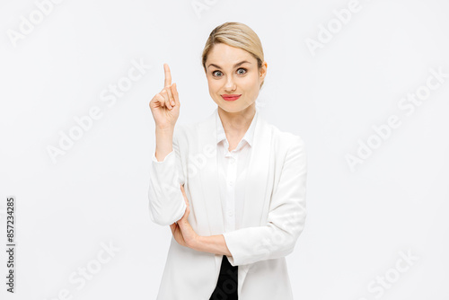 Portrait of a happy young blonde woman having many ideas over isolated white background. Positive expression of a human face, emotions, feeling of perception of life. Decision making process concept.
